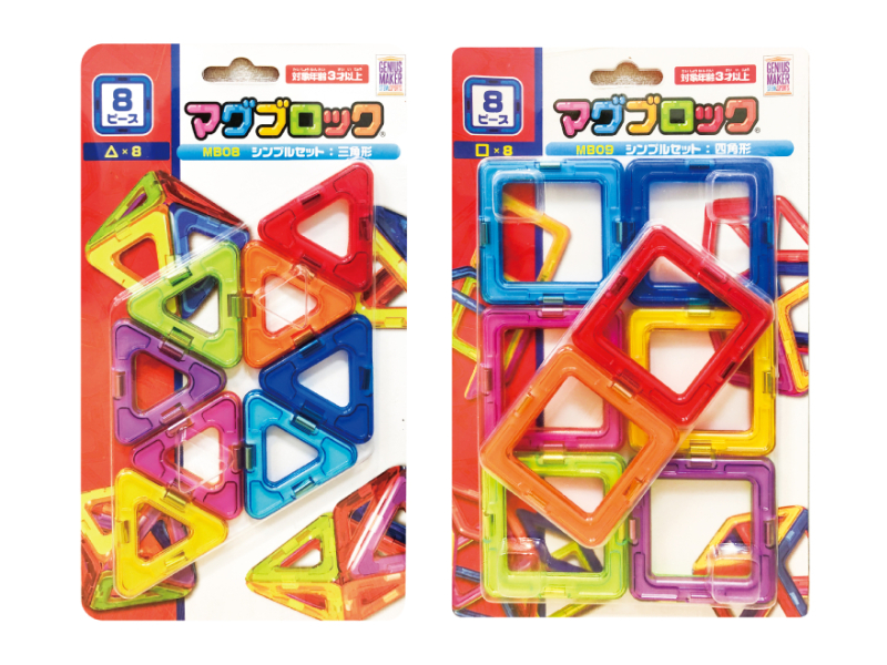 「マグブロック」は各辺に磁石が内蔵されたブロックで、三角形や四角形などの形で構成されている。内蔵された磁石は、磁石同士が反発しない不思議な仕組みでできていて、ストレスなく思うままに作品作りができるのが魅力のひとつ。