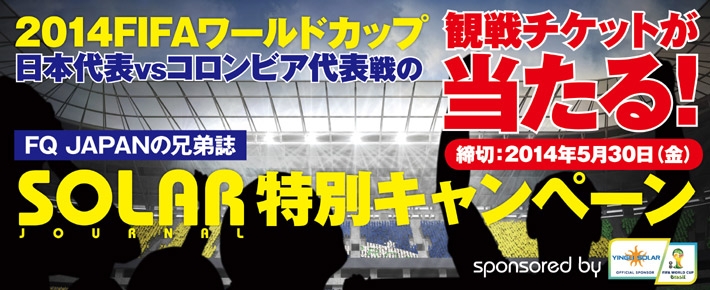 SOLAR JOURNALが、2014FIFAワールドカップの公式スポンサー「インリーソーラー」のご協力を得て、日本代表vsコロンビア代表戦のチケットが当たる特別企画を実施中。
