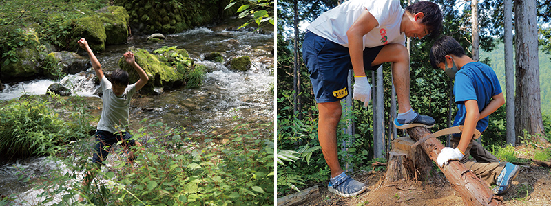 「ひのはら ちきゅうのがっこう」は、親子で遊び、そして学ぶ、最高にワイルドなプログラム。季節を通して森に集まり、散策と樹木や生物の観察、そして林業従事者と道づくり! 火をおこしたり、野山の食材をとって食べたり。日常では考えられない貴重な自然体験を親子で楽しむことができる。