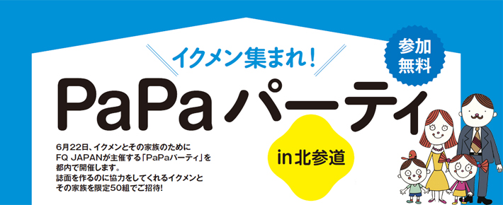 6月22日、イクメンとそのご家族のためにFQ JAPANが主催する「PaPaパーティ」を都内で開催します。誌面制作に協力をしてくれるイクメンとその家族を限定50組でご招待! “いつもとちょっと違う”ファミリー撮影会、FQ JAPAN編集部へ誌面の意見や育児の悩みや相談をする“パパ会”など、盛りだくさんの内容で実施いたします。今回はお子様が2~6歳のご家族を対象としたイベントです! 6/11現在、招待枠に若干の余裕があります! 「面白そう……」と思ったアナタ、今スグ参加応募を!