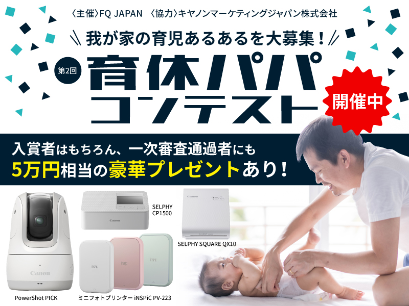 男性育休取得促進に向け、 10月に改正法が施行されました。男性の育休をさらに後押しすべく、FQ JAPANはスポンサーにキヤノンマーケティングジャパン株式会社を迎え、昨年大盛況だった「育休パパコンテスト」を今年も開催中!