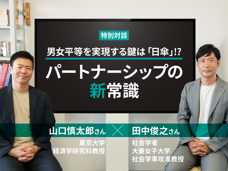 ジェンダー平等が叫ばれて久しいが道のりはまだ長い。要因のひとつは、自分事化として捉えられている人が多くないことが挙げられる。実現のため、私たちにできることはあるのだろうか。社会学者・田中俊之先生と経済学者・山口慎太郎先生に解決のヒントをお話いただいた。