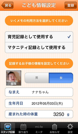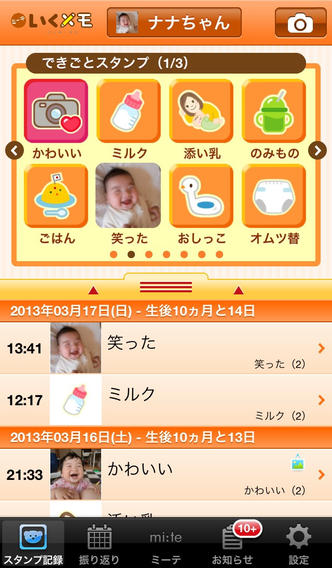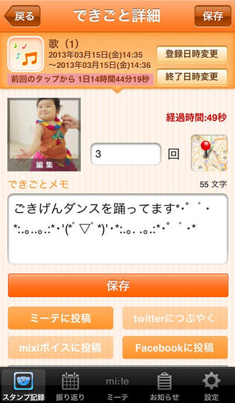Facebookやmixi、Twitter、さらには絵本子育てをテーマにした情報サイト「ミーテ」との連動も可能!写真入りオリジナルスタンプも作成できるので「自分たちだけの子育て記録」を作って楽しもう。