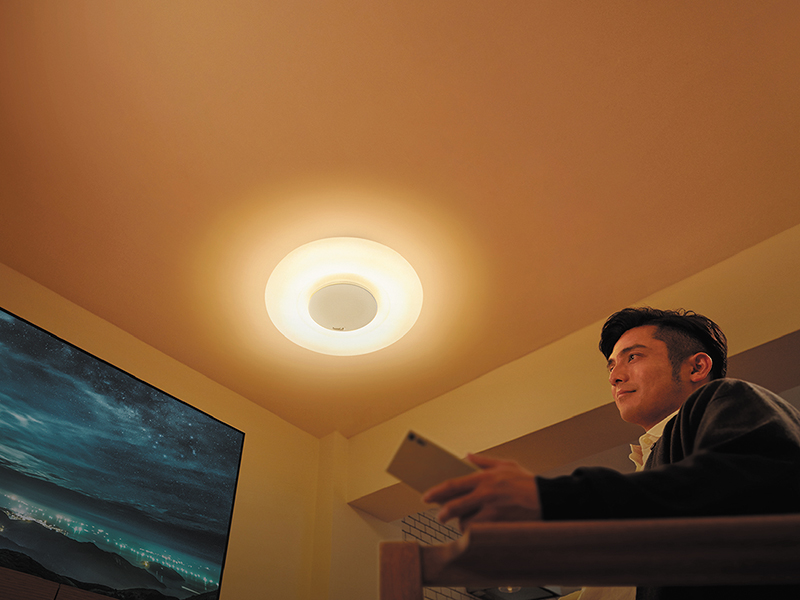 スピーカーと照明が一体型のシーリングライト。アプリやスマートコントローラー、アレクサで簡単に操作できる。天井から音が降り注ぐ立体的な音でいつものテレビで臨場感あふれる映像をたのしむことができる。家族で過ごすおうち時間にぜひ取り入れたいアイテムだ。
