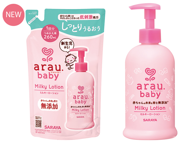 入浴後は必ず、肌にやさしいローションやクリームで保湿をしよう。『アラウ.ベビー ミルキーローション』 は、よく伸びて全身に塗りやすいのに加え、赤ちゃんの皮脂に似た植物オイルを厳選。発酵技術から生まれた独自のやさしい天然乳化成分も配合している。
