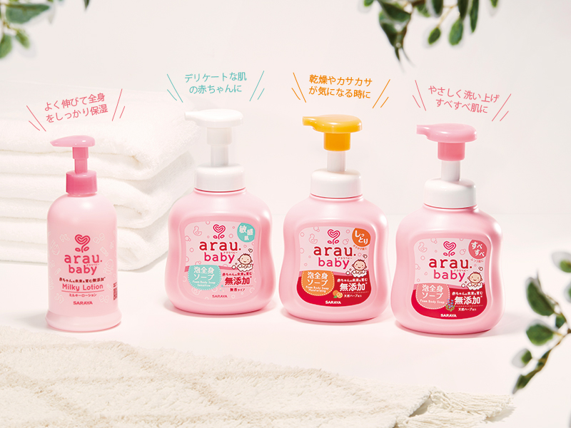例えば、サラヤの『アラウ.ベビー 泡全身ソープ』シリーズは、容器の一部に植物由来の樹脂や再生素材を使用。原料にパーム油を使用している商品には「RSPO認証」を取得し、普及を支援するなど、環境への配慮が万全だ。同時に、肌への刺激となる化学成分を排除。植物性せっけん成分に、サラヤ独自の“肌すこやか成分”を配合することで、洗浄成分までを残さず洗い流せる仕様となっている。