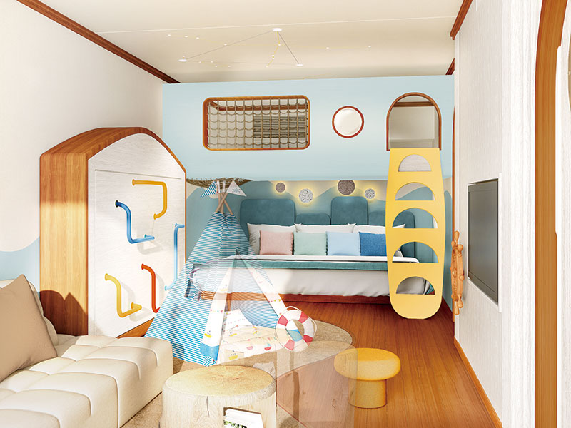 レストランと同時に新設されたベビー・キッズ向けの2種類の客室は、子どもが船のキャプテンになったような気分で遊べる仕掛けやおもちゃがたくさん。ミキハウス子育て総研『ウェルカムベビーのお宿』に認定されており、もちろん安全面にも配慮されているので安心だ。春にオープン予定の屋内「キッズプレイエリア」も今から待ち遠しい。