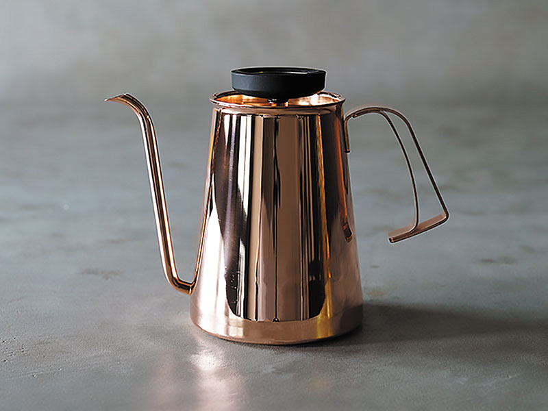 燕三条製のステンレスドリップケトル。注ぎ口はドリップに最適なノズルの太さや先端形状にこだわったデザインを採用。湯量の強弱をコントロールしやすく、湯切れが良く安定感があり本格的なコーヒー抽出をサポートしてくれる。フタにはアナログ温度計を搭載し、紅茶やミルクなどさまざまな飲み物に適切な温度で抽出が可能だ。