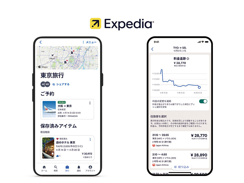 旅行予約のストレスを軽減できるアプリサービス。プライストラッカーは、検索したフライトの価格変動をプッシュ通知でお知らせ。安いタイミングを逃さずチケットの予約ができる。ホテルや航空券、ツアーまで保存した候補を一元管理できるトリッププランナーは、複数人での編集が可能。オンラインで旅程を確認、コメントできるため、スムーズな計画づくりに役立つ。