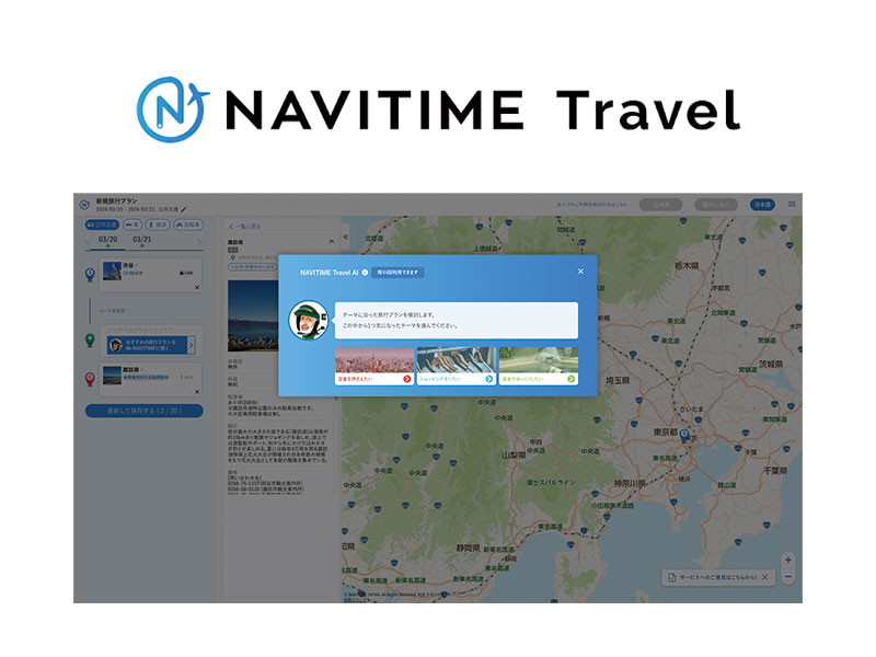 手軽な旅行プランの作成や新たな旅行ニーズの発見を叶えるサービス。興味のある「テーマ」を選択すると、出発地点と目的地点の間で立ち寄れるおすすめの観光スポットを、最適な順番で巡るプランが作成される。プランのおすすめポイントやその土地の紹介文を自動生成するAI機能も搭載しており、旅先での体験を具体的にイメージすることが可能。