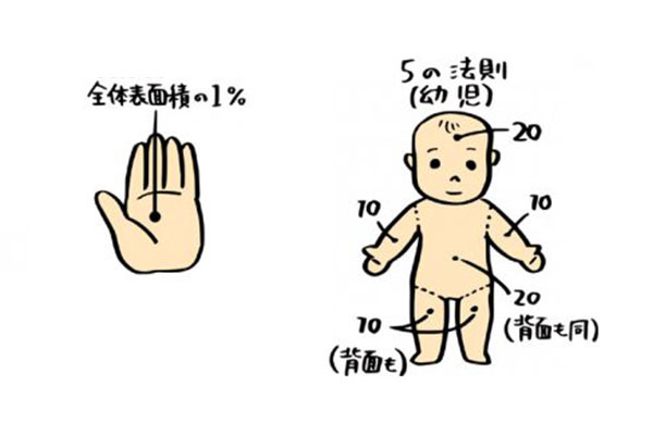 体表の10%以上で生命の危険に。手のひらは体表面積の1%なので広さの目処に。頭部・腹部で20%、片腕・片足で10%。