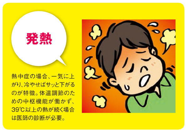 夏場は38℃前後であれば微熱の範囲内。熱中症の場合は、パーッと上がって、冷やせばサッと下がる。39℃以上が一晩以上も続くようであれば診察を。