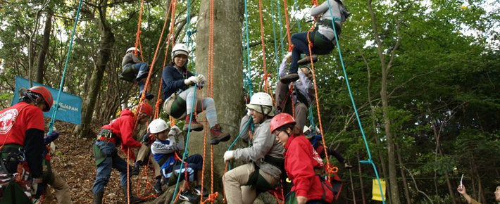 この木こり塾では、普段の生活では体験できない体を使った遊び、ツリークライミングや丸太切りが体験できる。ツリークライミングでは、専用のロープやサドル、安全保護具を利用して行われる為、大人から子供(小学生以上)まで、経験の有無に関係なく安心して楽しめるのが特長だ。