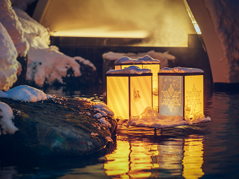 露天風呂に浮かぶ雪をモチーフにした「こぎん刺し灯籠」。