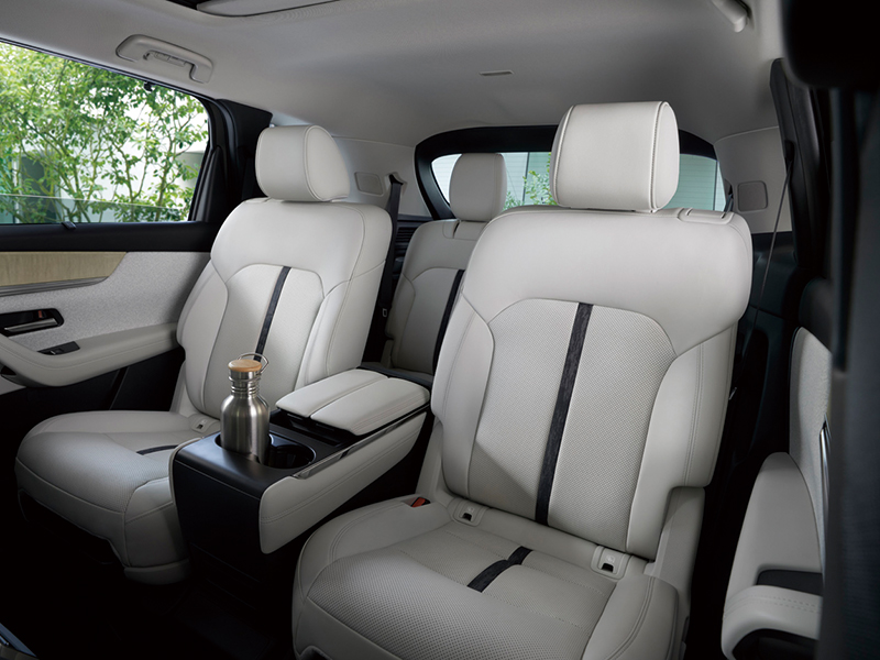 ホワイトのナッパレザーなど贅沢な素材で仕上げたインテリアは、3列目まで心地よく過ごせる。PHEVは約75kmのEV走行が可能。