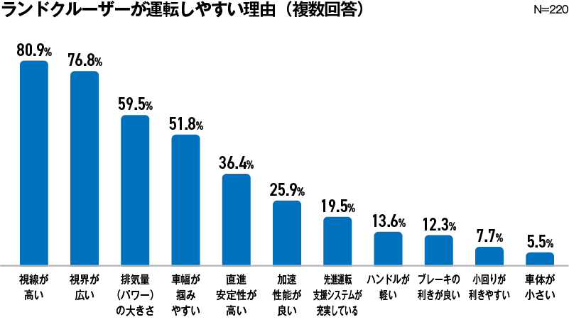今回のアンケートにおいても、ランドクルーザーはその条件のほとんどをクリアしてしまう。自分の乗っている車の運転のしやすさについてにアンケートでは、ランドクルーザーの利用者は約97%が運転しやすいと言っている。