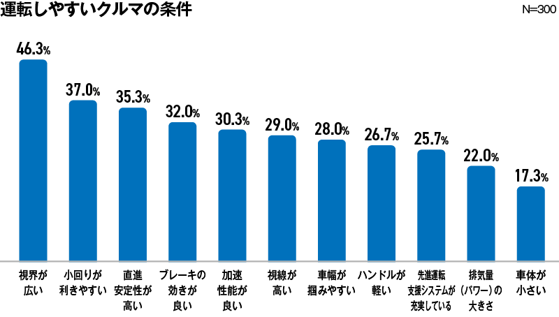 アンケートの結果、最も多かった運転しやすい車の条件は「視界が広い」だった。全体の46.3%の回答にこの条件が組み込まれていることからも、視界の広さがいかに運転に影響するかがわかる。