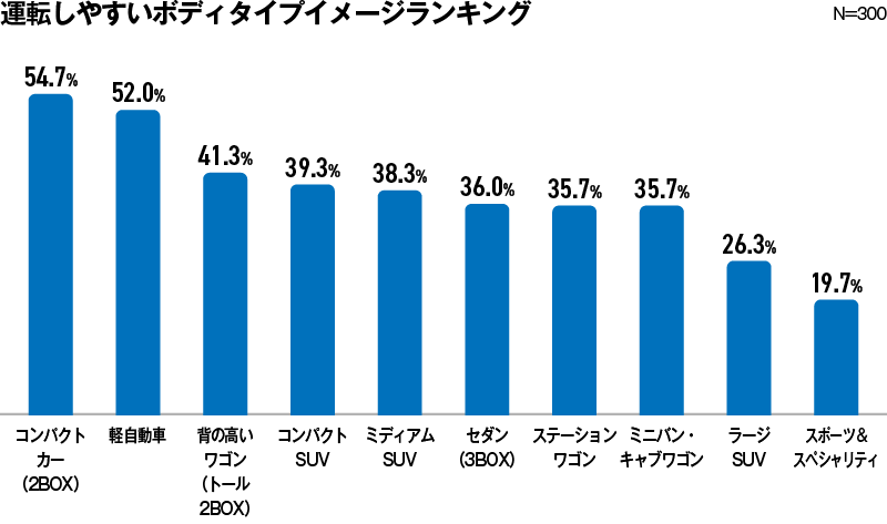 意外なことにコンパクトカー、軽自動車などの小型の車が理想のボディタイプとして挙げられた。たしかに小回りの利きやすさや、幅をあまりとらないなどの観点から見れば、小型自動車が運転しやすいのは間違いないだろう。