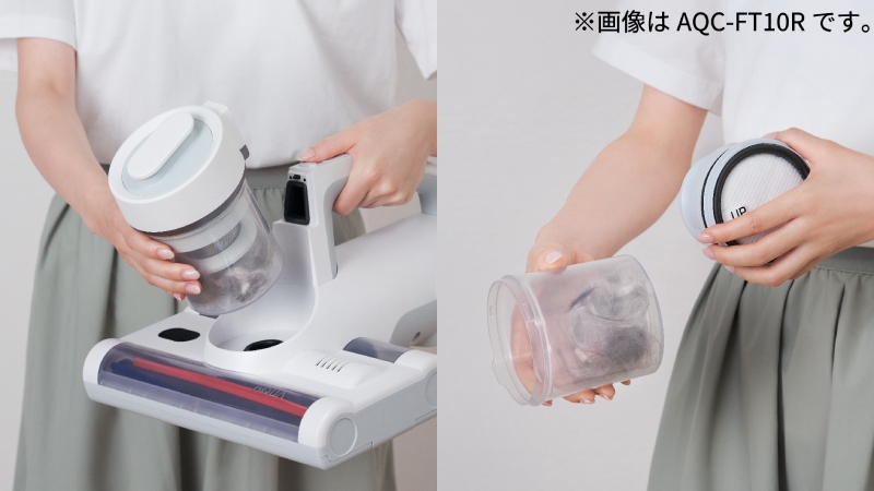 ダストカップの取り外しはワンタッチ! 手を汚しにくいのでサッとゴミ捨てできる。