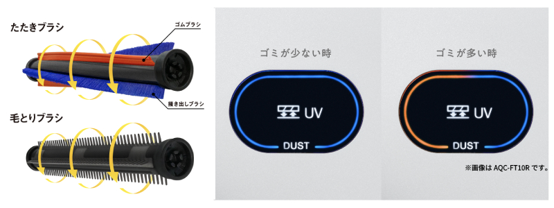 さらに、今回プレゼントのハイエンドモデルは、細かい毛の除去率がさらにアップする「毛とりブラシ」や、目に見えないホコリやダニ、花粉などのアレル物質の除去が確認できる「キレイがわかるセンサー」が付き、1分間のたたき回数が28,800回(毛とりブラシ・たたきブラシ合算)と、より頼もしいスペックだ。