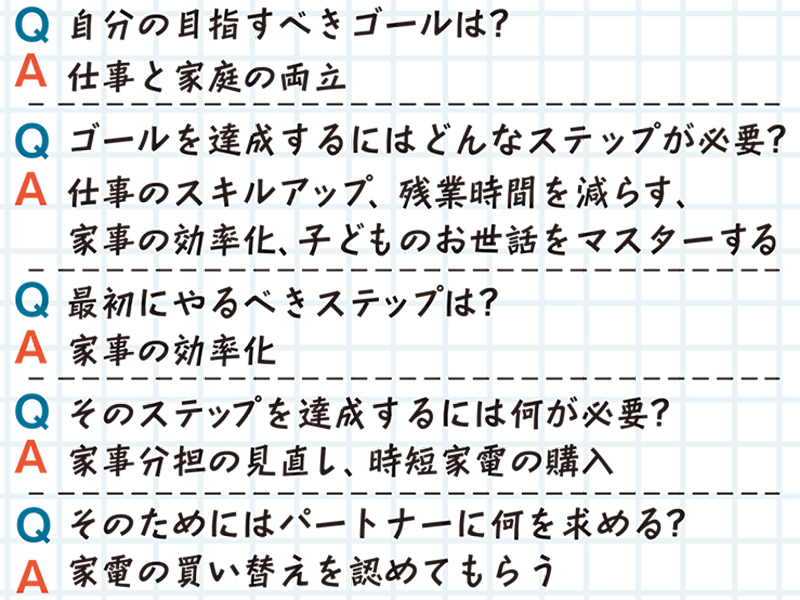 まずはアウトプットで自己開示をしてみよう。育児を経験した先輩・上司のロールモデルをみつける「聞くアプトプット」に加えて、「書くアウトプット」もモヤモヤ解消におすすめだ。方法は、電車移動中などちょっとした時間に、「どんな家族関係を目指しているのか」「子どもが何歳までに、どんなふうにキャリアを形成したいか」などを振り返って書くだけ。1日数分でもその時間をとることで、目指すゴールに行くための課題が明確になる。書いた結果を持ち寄り、パートナー同士で話し合うのもおすすめだ。