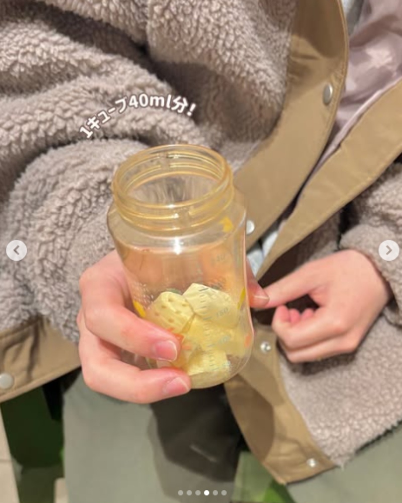 前までは1回分ずつ粉ミルクを小分けにして持ち歩いていたけど、今は離乳食を食べる量によってミルクの量を変えているので、調整できるキューブが便利!