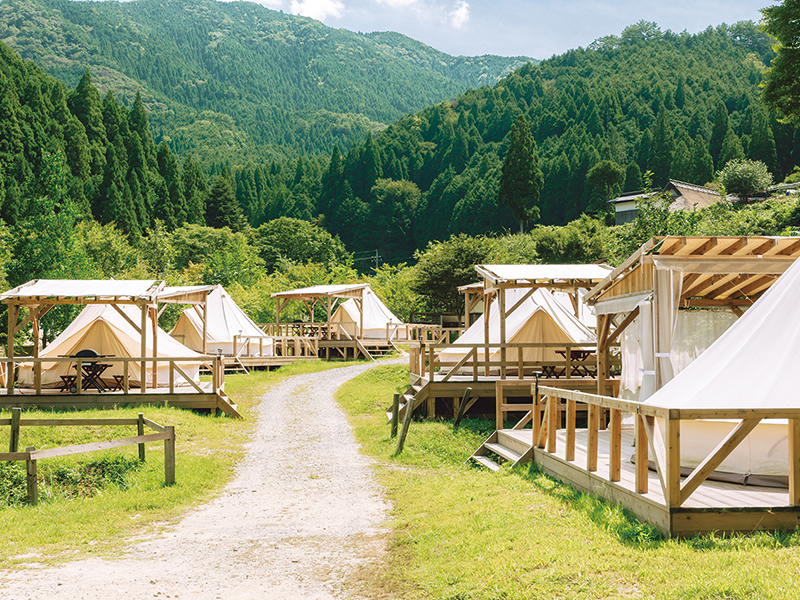 日本の原風景が残る、岡山県内の里山にあるグランピング施設。「丁寧な時間を過ごす、田舎暮らしリゾート」というコンセプトの通り、豊かな自然と川のせせらぎに囲まれて暮らすように過ごすことができる。