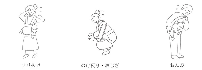 2つ目は『のけ反り・おじぎ』。こちらも主に首が座る前の乳幼児だが、親がのけぞったり、お辞儀などの前かがみの体勢を取った拍子に身体が、抱っこひもから飛び出てしまうという事例が多いようだ。