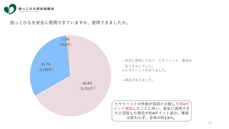 また全体の約1.5%は抱っこひもを使用していながら、ケガ等の事故が発生しており、ケガの約半数は落下事故だったとのことだ。