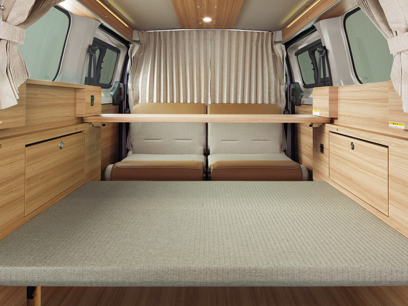 間接照明が灯り、明るい木目調のおしゃれな空間。走行時と停車時で座り心地が変わる後席が秀逸。オプションのカーテンで目隠しもでき、着替えや授乳などにも便利。