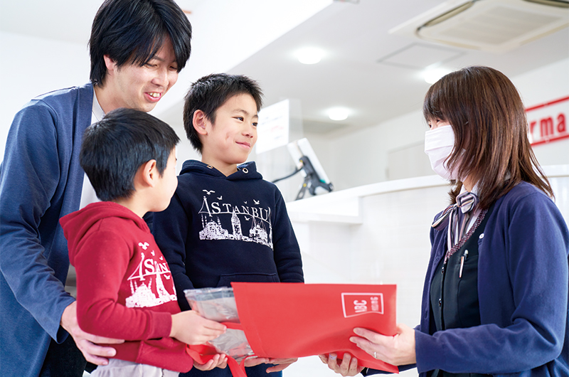 センターハウスとは総合受付のこと。予約をしていればもちろん、していなくても、受付をしてアンケートに答えればプレゼントがもらえる(※)ので、ぜひ最初に立ち寄りたい。希望者には家を建てる計画や見学時のメモなどを書き込める『住まいづくり計画ノート』等ももらえるので、受付で声をかけてみよう。トイレやおむつ替えスペース、授乳室、キッズスペースなどもあり、休憩にも便利だ。