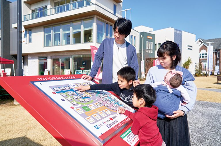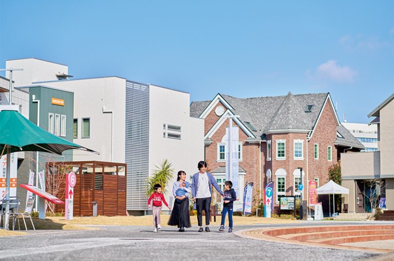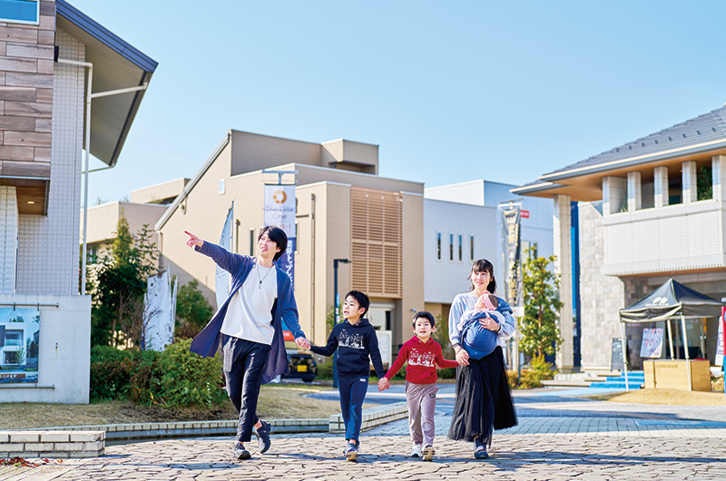 40棟以上の多彩なモデルハウスが勢ぞろいしている様子は、まるで1つの街のよう。広場やステージ、休憩スポットなどもあり、犬の散歩をする人も。週末はイベントが開催されることも多いので、お出かけ先としても楽しめる。今回体験してくれる吉村さんファミリーは、「イベントで何回か遊びに来たことがあるけど、モデルハウス見学は初めて」とのこと。どんな体験になるのだろうか。