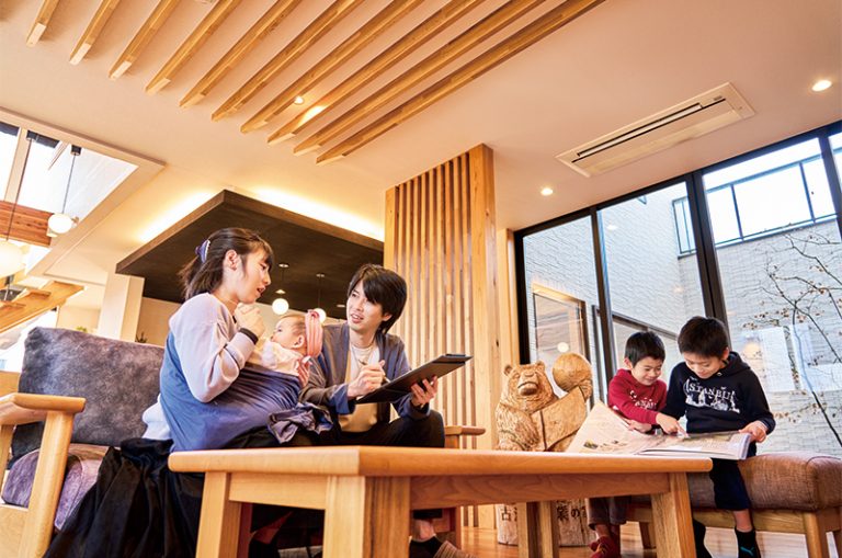 いよいよモデルハウスへ。今回読者ファミリーが体験したのは、国産材100%の構造と自然素材が特徴の『古河林業』の家。一歩入った途端……「すご~い、いい香り!」。部屋中を包む木の香りに、写真や動画では伝わりきらないポイントを体感。実際の間取り例やデザインもじっくりと見ることができ、暮らすイメージが膨らんだ。予約をしておけば、担当者に家づくりについての質問をしたり、住宅ローンなどのお金の質問・相談をすることもできる。