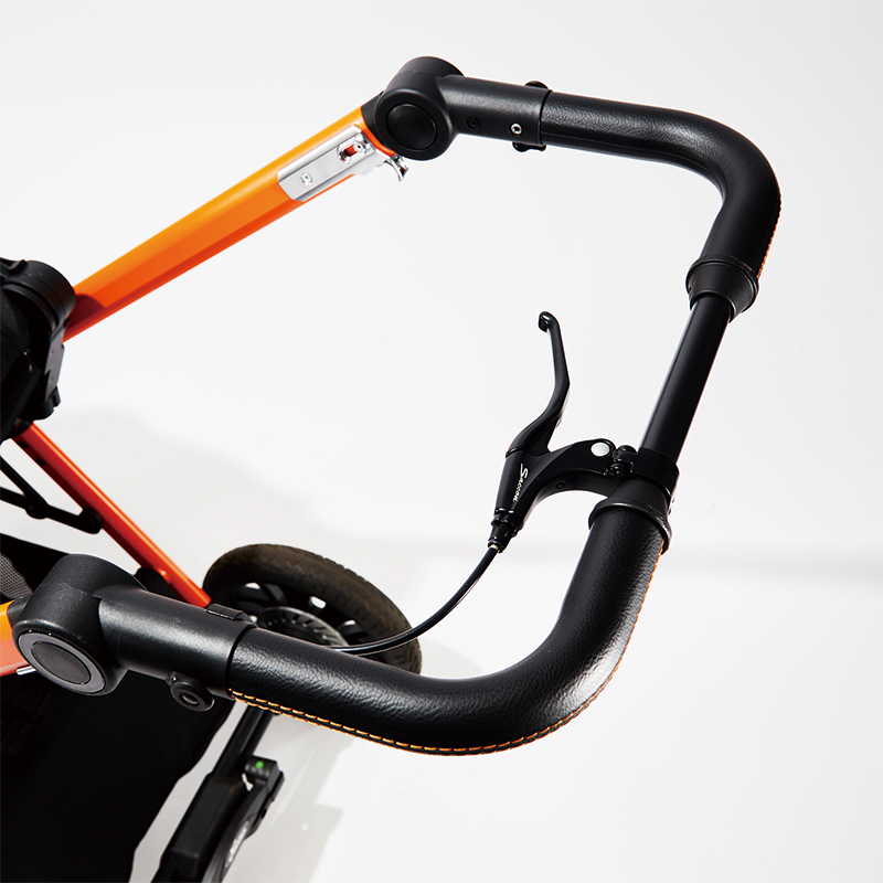▲ハンドルにはハンドブレーキを搭載。スピードが出る坂道や滑りやすい雨天時でも安心して走行できる。