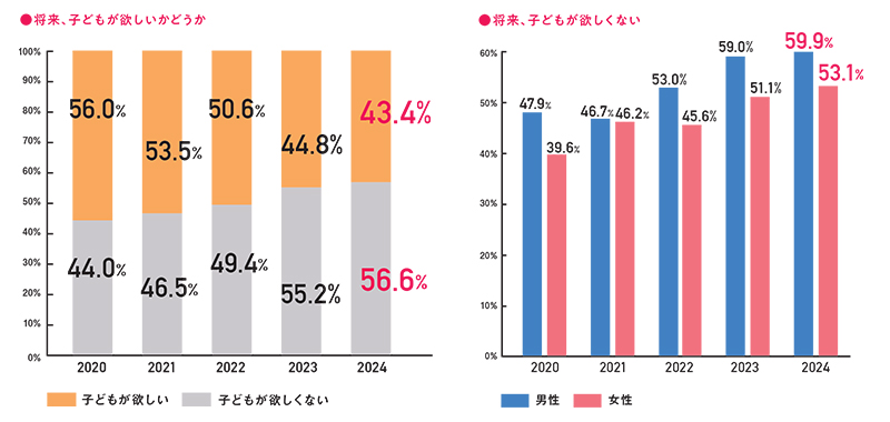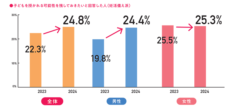 一方で、子どもが欲しくないと回答した未婚男女の約4人に1人は、子どもを授かれる可能性を残したい「妊活備え派」であることがわかった。特に、男性は昨年から4.6%増加しており、必ずしも子どもを持つことに否定的なわけではないことが判明した。