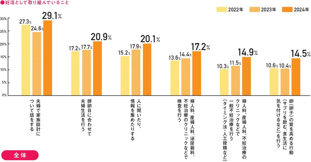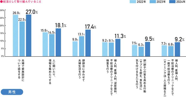 また、夫婦を対象に行った「妊活として取り組んでいること」に関する質問では、過去3年間の比較で「夫婦で家族設計について話をする」「排卵日に合わせて夫婦生活を行う」といった回答に増加傾向が見られた。共に妊活取り組む夫婦が増えていることがわかる。