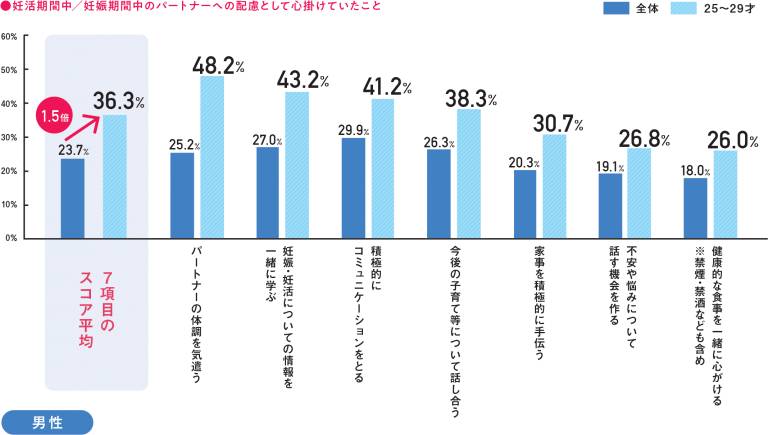特に、妊活経験男性のうち20代後半の層において、妊活への主体性が高い傾向にあることがわかった。20代後半男性の妊活行動率は、男性全体と比べ約1.5倍も高くなっている。パートナーの体調を気遣ったり、一緒に妊娠や妊活について学んだりする機会が多い。