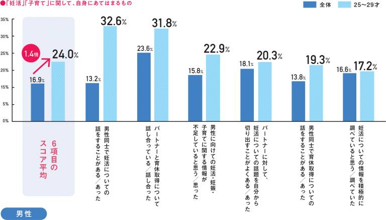 さらに、20代後半の男性は他の年代よりも妊活や育児休業への関心も全体的に高いことが判明した。興味深いのは「男性同士で妊活についての話をすることがある/した」という問に対して、全体が13.2%と他設問でも最も低い一方、20代後半の男性は32.6%があると最も多いということだ。これまで出産は女性の問題とされていたが、若い世代では出産・育児は男女関係なく関わるものであるという意識が当たり前のものとして定着しつつあると言えるだろう。