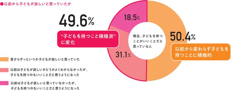 また、子どもを持つことに対する意識は移ろいやすいことも明らかに。現在子どもを持つのもいいことだと思っている人のうち、子どもを持つことに対し“消極派”から”積極派”に変化した人が約50%という結果になった。子どもが欲しいかどうかの意識は変化しやすいようだ。