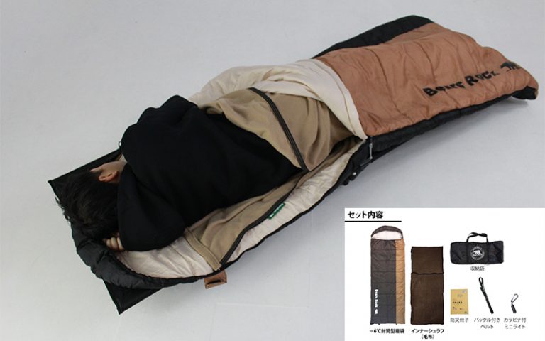 適正温度-2℃まで対応する、防寒性に優れた丸洗いできるシュラフ。冷気の侵入を防ぎ、保温性を確保する工夫が繊維やジッパー部分に施されている。ダブルファスナー仕様で温度調節がしやすく、同じ寝袋同士で連結させれば、親子で添い寝できるサイズになる。収納袋付きで持ち運びやすく、災害時の備蓄品として最適。