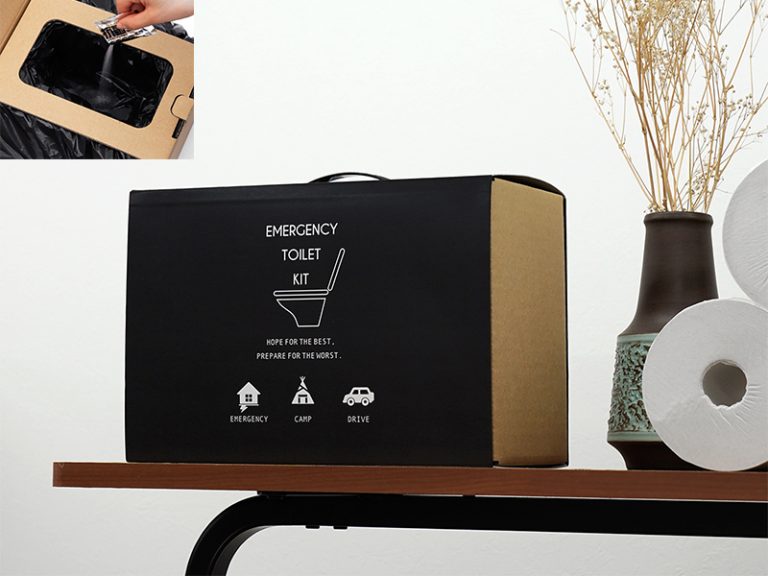 防災グッズに見えないデザインで、インテリアに馴染むトイレキット。袋をセットし、抗菌性凝固剤を振りかけるだけで使用できる。段ボール製の簡易トイレ付きのため、このキット一つでトイレが完成する。素早く固まりたっぷり吸収してくれて、消臭効果も抜群。災害時の断水や避難生活のためにストックして置くと安心だ。