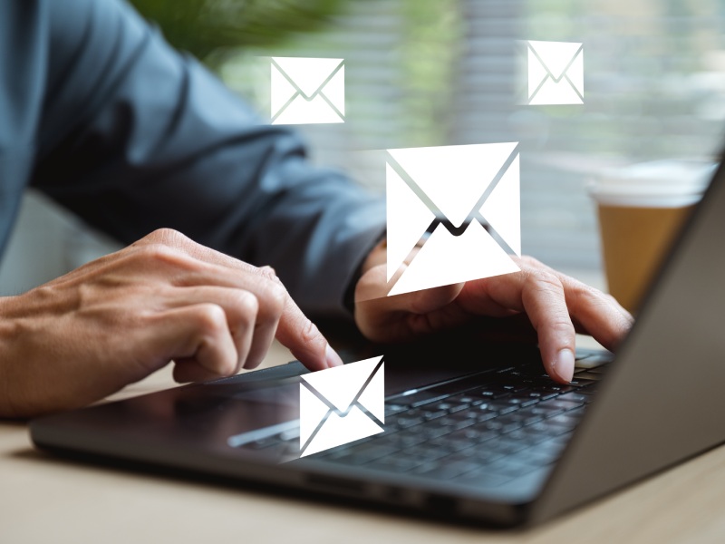 Email receive invitation contact. Newsletter mail reminder. Interface send receive. A person is using a laptop to send emails. The laptop screen is filled with multiple emails.