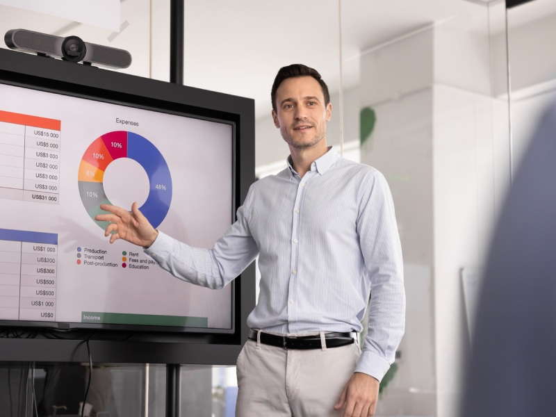 Confident business product owner presenting marketing report on team meeting in boardroom, standing at large electronic screen, pointing at statistic financial data, giving training