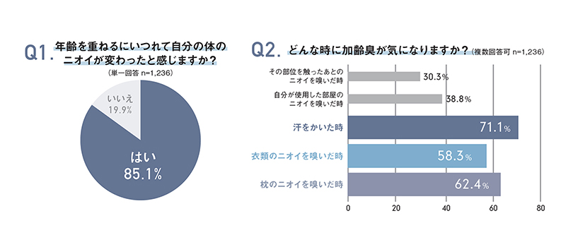 年齢を重ねると気になってくるのが体臭だ。左の25歳から54歳までの男性を対象とした意識調査(デオナチュレを展開するシービック社が実施)でも、85.1%が匂いの変化を感じ、特に汗や衣類、枕の匂いが気になっていると回答している。そもそも体臭は、汗と皮膚表面の細菌が混じり合うことで発生する。
