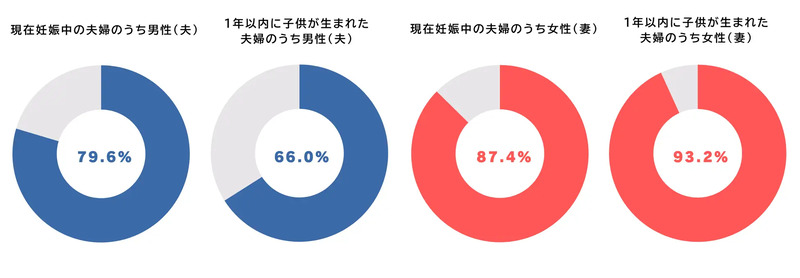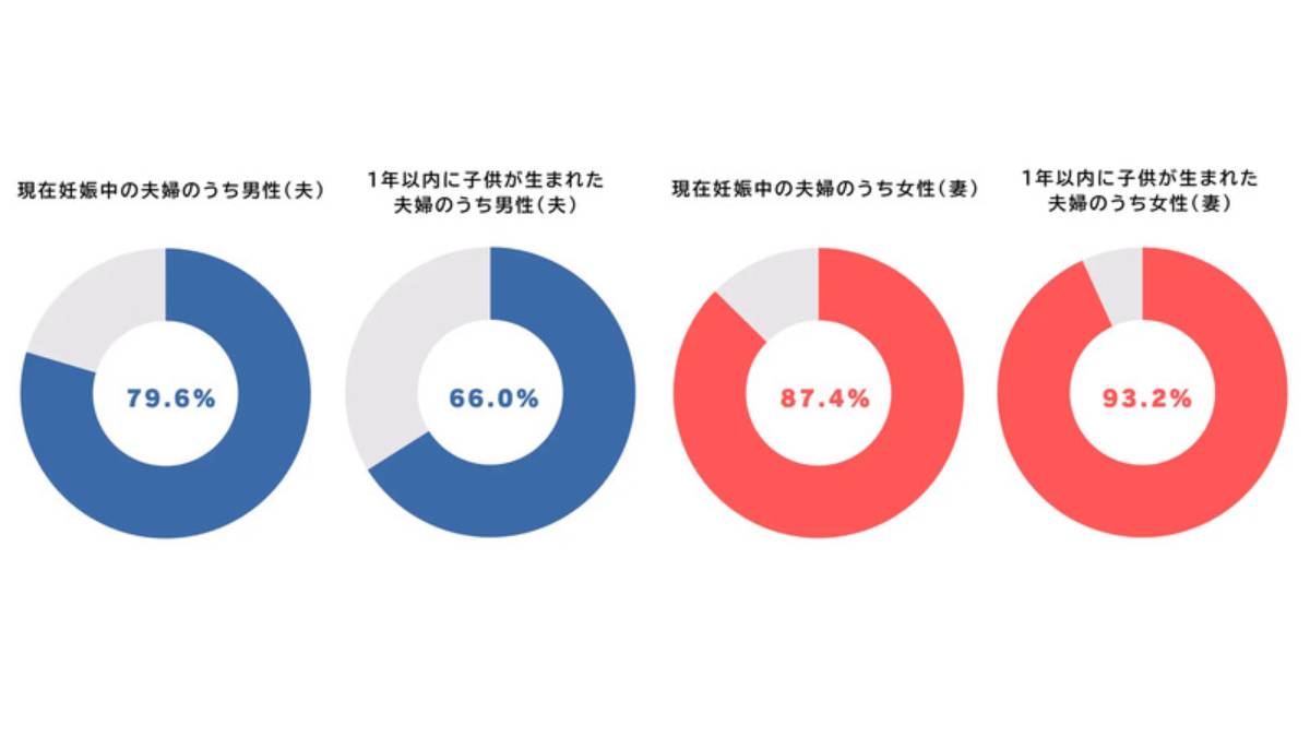 また、男性内でも、妊娠中と産後で10%ほど違うことがわかる。これは、産後に入ってから家事意識が落ちる男性が多いということを意味している。