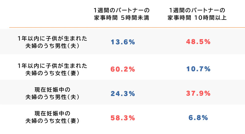 結果としては、パートナーが週に5時間未満しか家事をしないと答えた女性の割合が6割にもなった。こちらは産後も妊娠中もあまり変わらない数字だった。また、上記の結果からしたら当然と言えば当然だが、反対に、パートナーが週に10時間以上家事をしてくれるという回答の男性の割合も非常に多かった。