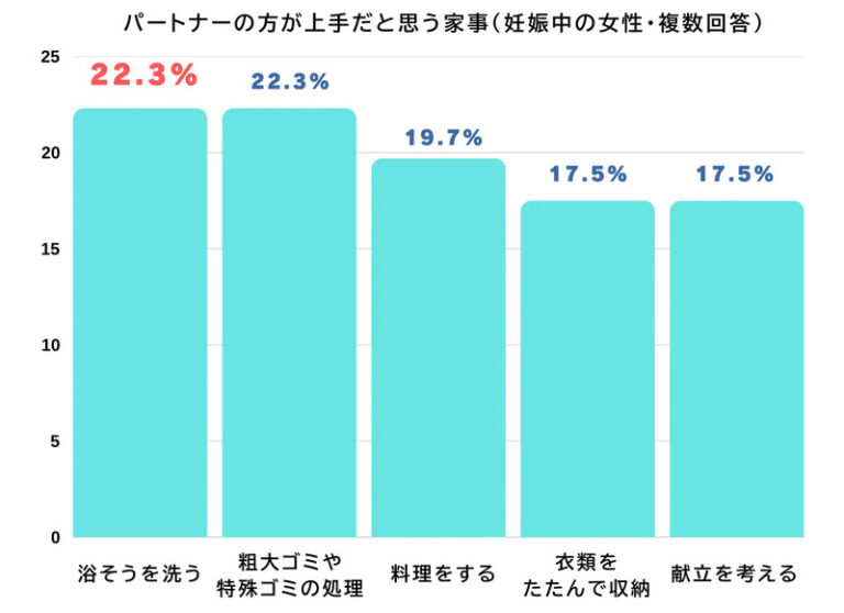 結果から言うと、最も多かったのは『浴槽を洗う』ことだった。一定の姿勢でこなせない分、妊娠中の身体には少し抵抗のある家事でもあるのだろう。