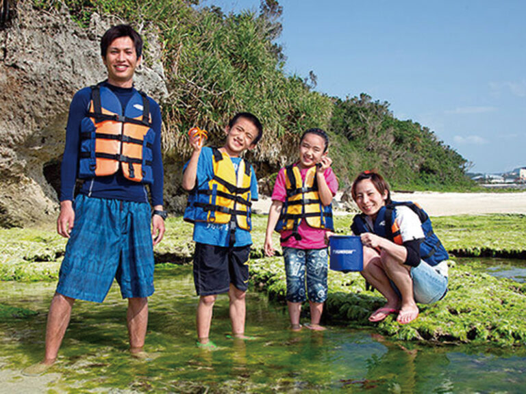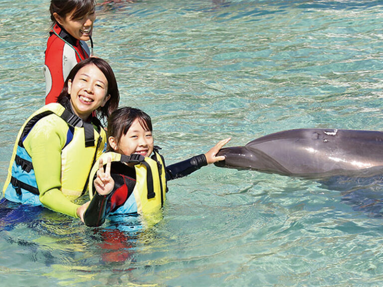 沖縄の自然や文化を一日中体験することができる施設。イルカと触れ合い・学べるドルフィンプログラム(0歳~)をはじめ、干潮時の海岸で生きものやサンゴを観察するイノー(浅瀬)探検(4歳~)など、プログラムは約50種!