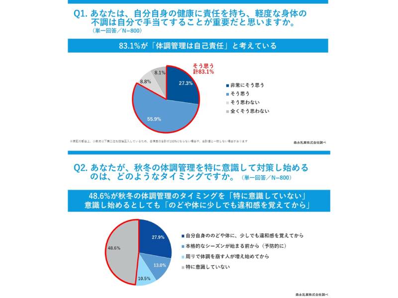 森永乳業が働く男女800人を対象に実施した「働く人の秋冬の体調管理に関する意識調査」によれば、自分自身の健康に責任を持ち、軽度な身体の不調は自分で手当てすることが重要だと考える人は83.1%と大半を占めた。ところが実際に体調管理を意識するタイミングについては、「特に意識していない」と答えた人が48.6%と半数近くにのぼった。