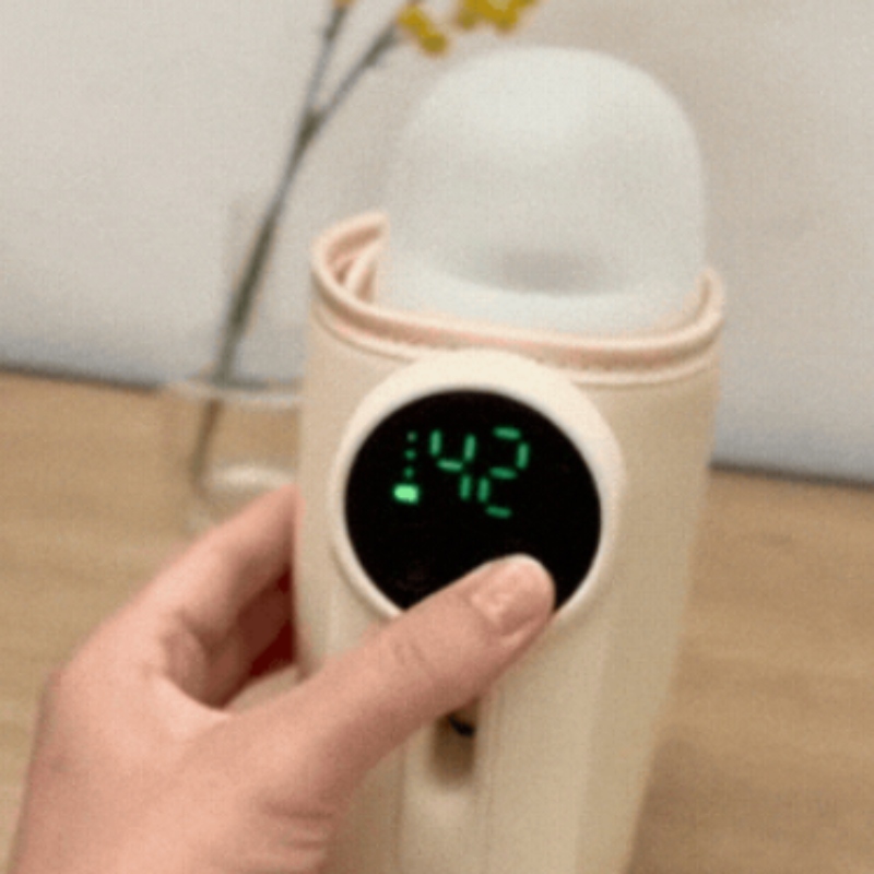 その名の通り、持ち運び可能なミルク温め装置だ。使い方は、温めたいミルクを哺乳瓶に入れ、ヒーター内蔵のスリーブをしっかり巻き、電源を入れたら温度設定をして温め準備完了。設定温度に達すると保温モードに自動で切り替わるので、逐一温度確認をしなくてもOK。
